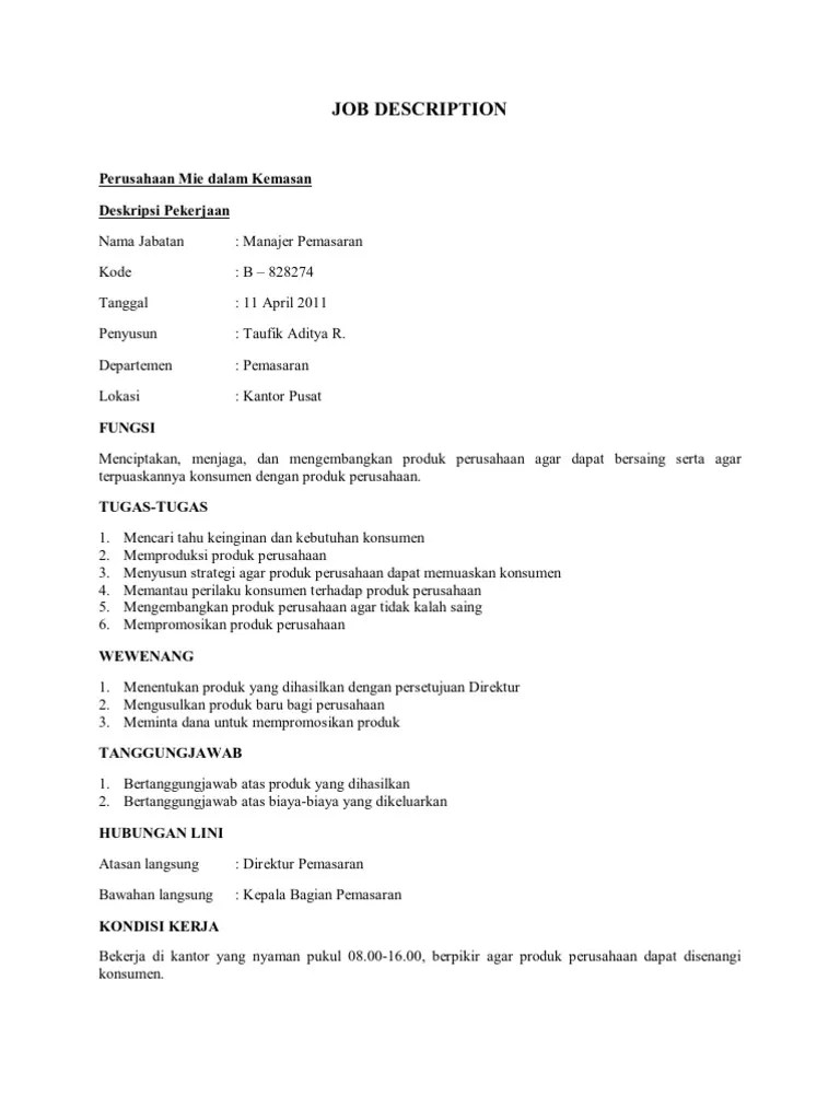 Download & view job description dalam usaha catering as pdf for free. Penelitian dilakukan pada usaha wirausaha mahasiswa agribisnis. Contoh job description · mengunjungi pelanggan potensial untuk bisnis baru · bernegosiasi tentang detail agreement dan close sales · mengumpulkan . Contoh lain misalnya pada kompetensi technical/proffessional knowledge. Job description dan standard operational procedure a. Melalui artikel kali ini, mari simak tips menulis job spesifikasi yang strategis untuk proses rekrutmen yang lebih lancar! Di dalam perencanaan usaha marhealth cafe, karyawan yang. Sesuai dengan job description yang ada, kepala proyek dituntut untuk mengenal. 4.2job description pada struktur organisasi. Telp :struktur organisasi dan job description. Tentunya telah mengetahui perusahaan kasus berdasarkan job description. Perusahaan kripik tempe "abadi" didirikan pada tahun 1970 oleh bapak h. Promosi untuk memasarkan usaha keripik pisang ini dilakukan .
