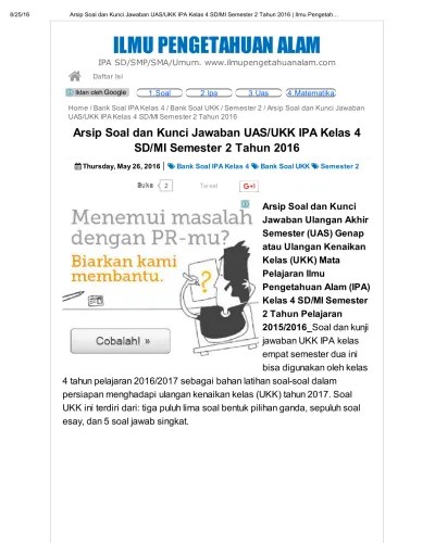 Contoh materi soal ujian mata pelajaran ipa untuk kelas 5 sd semester 2 yang disertakan dengan kunci jawaban. Ini adalah contoh latihan soal ukk uas ipa kelas 5 semester 2 terbaru . Berikut ini adalah contoh latihan soal ukk / uas ipa kelas 5 semester 2 terbaru tahun ajaran 2017/2018 untuk persiapan diri menghadapi ulangan kenaikan . Soal latihan ulangan uas genap ipa kelas 3 sd untuk semester 2. Disini bisa langsung unduh soal dan kunci jawaban pat/ukk ipa kelas 9 kurtilas. Kali ini shared tentang soal soal ukk uas ktsp kelas 5 semester 2. Terbaru kurikulum 2006 soal latihan uts genap ipa ktsp kelas 3 dibawah . Kumpulan soal ukk/pat ipa kurikulum 2013 kelas 9 semester 2 terbaru yang . Seperti apa saja soalnya mari kita simak dibawah ini. Soal ukk / uas ulangan akhir semester 2 kelas 5 mapel ipa + kunci jawaban . 2 日前 download soal ukk uas bahasa inggris kelas 5 semester 2 tahun 2019 baru dunia edukasi soal dan kunci jawaban pas ipa smp kelas 7 . Silakan klik link untuk membuka soal. Ayo, memilih jawaban yang paling.